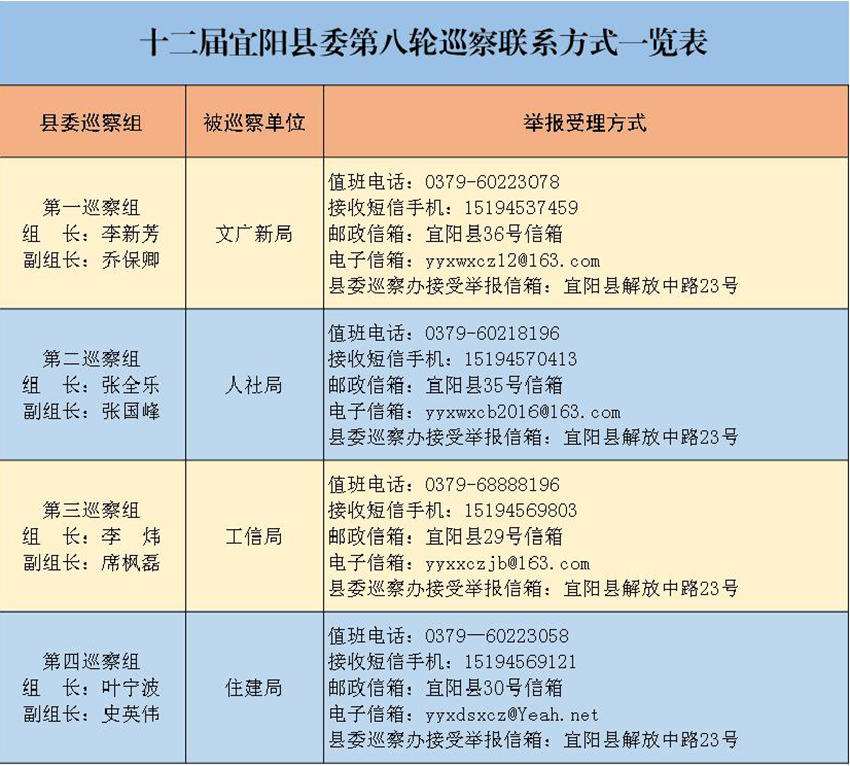 巡察期间,各巡察组均开通专门值班电话、邮政信箱、电子邮箱、接收短信手机,受理信访举报的时间为工作日上班时间。